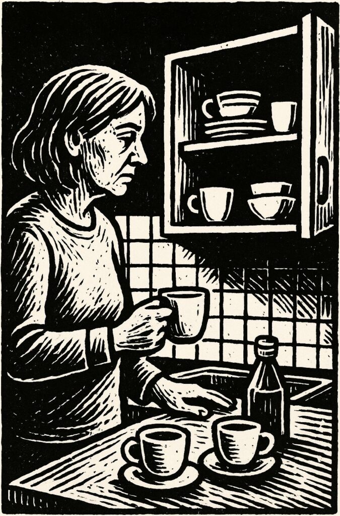 Ich halte Tassen, als könnte Keramik trösten. Zucker, Milch, Worte — alles steht bereit, keiner greift zu. Ohnmacht lässt sich in Untertassen gießen, habe ich gelernt. Es klappert, sehr leise, und doch viel zu laut.