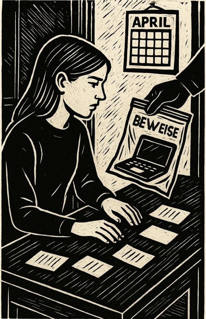 Man sagt, Durchsuchungen seien nüchtern, stichpunktartig, Inventar in Bewegung. Laptop, Telefon, Notizen — das Alphabet der Gegenwart — wandern in Beutel, Beweismittel nennen sie das. Im Zimmer steht ein Kalender: Abi bald, fast zum Greifen nah. Das Datum seufzt. Papier raschelt.
