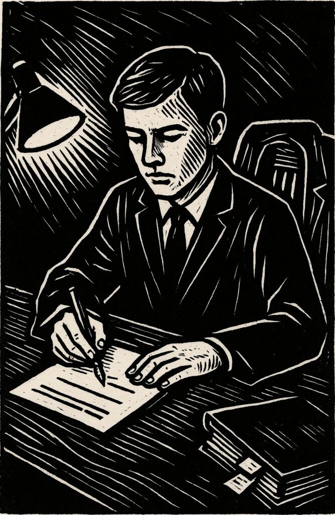 Vor mir Sätze, hinter mir der Anspruch, einer zu sein. Unterschreiben ist ein kleines Wort mit großem Gewicht. Unabhängigkeit bedeutet auch: sich trauen. Später lese ich die Aufhebung. Ich lerne: Verantwortung zittert nicht in der Hand, sondern danach.