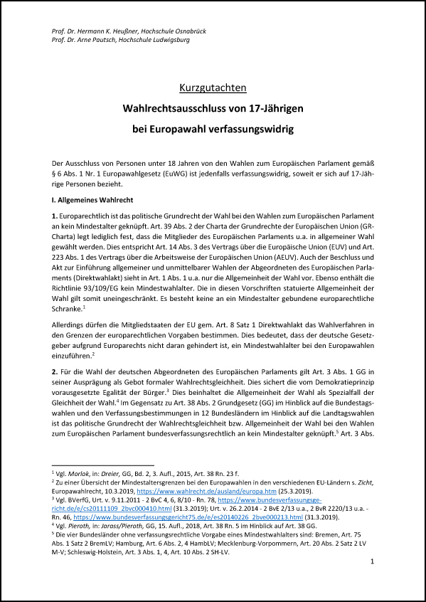 (Berlin, 9. April 2019) Ein Rechtsgutachten von Prof. Dr. Hermann Heußner (Hochschule Osnabrück) und Prof. Dr. Arne Pautsch (Hochschule Ludwigsburg) kommt zu dem Ergebnis, dass der Wahlrechtsausschluss von 17-Jährigen bei der Europawahl verfassungswidrig ist. Dem Gutachten zufolge schreibt weder das Grundgesetz noch das Europarecht ein Wahlmindestalter von 18 Jahren für die Wahlen zum Europäischen Parlament fest.