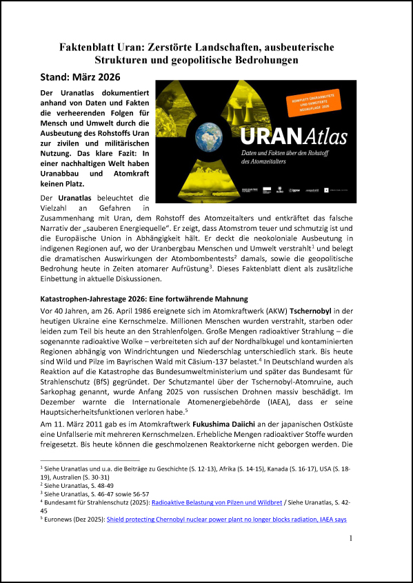(München / Berlin / Hamburg, 3. März 2026) Anlässlich des 15. Jahrestages der Reaktorkatastrophe von Fukushima am 11. März 2026 und des 40. Jahrestages der Katastrophe von Tschernobyl warnen die Herausgeber*innen des Uranatlas 2026 vor einem neuen nuklearen Wettrüsten. „Nicht nur modernisieren alle Atomwaffenstaaten ihre Arsenale und Trägersysteme. Es besteht darüber hinaus die große Gefahr, dass weitere Staaten Atomwaffen herstellen“, erklären die Herausgeber*innen und appellieren gemeinsam an die Bundesregierung, sich für nukleare Rüstungskontrolle, einen erneuten New-Start-Vertrag und Abrüstung einzusetzen.